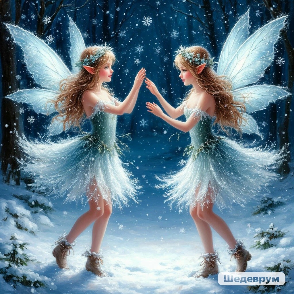В королевстве Зимних Чудес, где небо касается земли серебристым полотном, жила королева снежинок по имени Кристалла. Она правила мудро и справедливо, создавая каждую зиму миллионы снежинок, каждая из которых несла в себе частичку её волшебства. В отличие от обычных снежинок, которые рождались в облаках, снежинки королевства были настоящими феями — маленькими, хрупкими созданиями с прозрачными крылышками и ледяными коронами. Среди них были три сестры: Сильва — старшая, с шестью острыми лучами, всегда серьёзная и ответственная; Миринда — средняя, с округлыми краями и игривым характером; и малышка Фрост — самая маленькая, но самая смелая из всех снежинок королевства. Каждый год королева Кристалла устраивала Большой Снежный Бал, на котором снежинки-феи танцевали в воздухе, создавая удивительные узоры перед тем, как отправиться в Большой Мир. Это был самый важный день для каждой снежинки. «В этом году, — объявила королева, — мы должны создать самую красивую метель, какую только видели