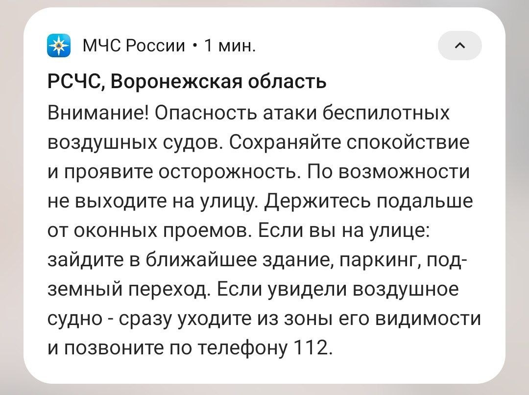 Местных жителей попросили не паниковать. В Воронежской области объявили опасность атаки украинских БПЛА. Об этом стало известно вечером 24 апреля. Сообщается, что соответствующий режим ввёл Александр Гусев на территории всего региона в 22:10. Губернатор попросил местных жителей сохранять спокойствие. – Силы ПВО наготове. Следите за дальнейшими оповещениями от правительства области или от МЧС России, – отметил глава Воронежской области. МЧС прислало воронежцам уведомления с памятками, что делать при режиме опасности атаки воздушных судов. Напомним, ранее украинские БПЛА пытались атаковать Воронежскую область – было сбито около 10 беспилотных летательных аппаратов. Дмитрий Амелин