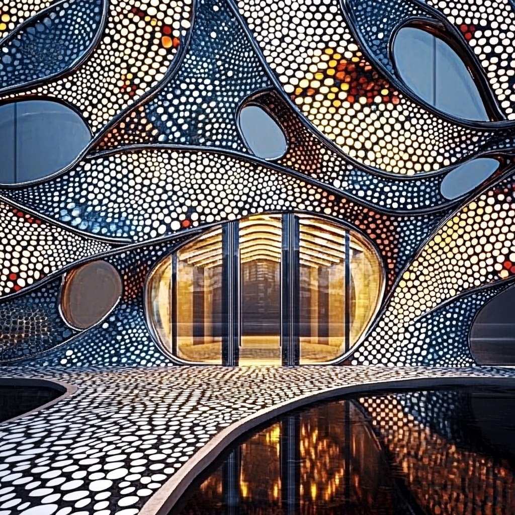 Создано на основе запроса: A grand futuristic building entrance inspired by Zaha Hadid's parametric architecture, featuring a dynamic geometric pattern with interwoven triangular and hexagonal shapes. The doors are sleek, made of curved glass and polished steel, embedded with illuminated lines that follow the fluid motion of the facade. The ceiling flows seamlessly into the walls with a tessellated pattern, creating a sense of movement. The lighting is dramatic, with cool blue and white LEDs highlighting the intricate details. Surrounding the entrance are reflective pools and minimalist landscaping, enhancing the futuristic aesthetic. Ultra-realistic, 8K, architectural visualization, cinematic lighting --- Автоперевод: Великий футуристический вход в здание, вдохновленный параметрической архитектурой Захи Хадид, с динамическим геометрическим рисунком с переплетенными треугольными и шестиугольными формами. Необычно получилось? 🤔 https://dzen.ru/id/65c0c65c86e4f837c27b24d7 #ИИ #A