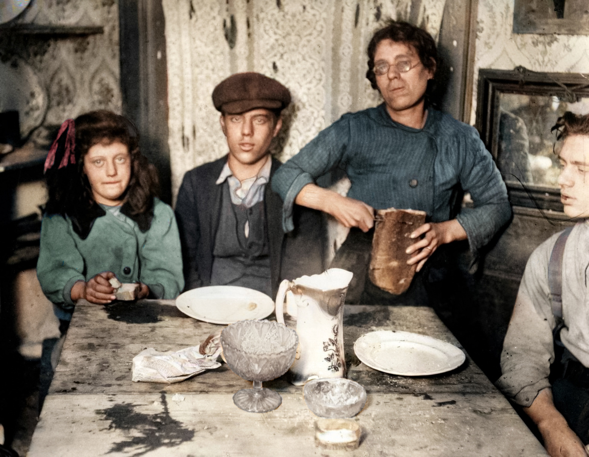 Хлебный обед для бедной семьи в Шадвелле, Восточный Лондон, 1920 год.
