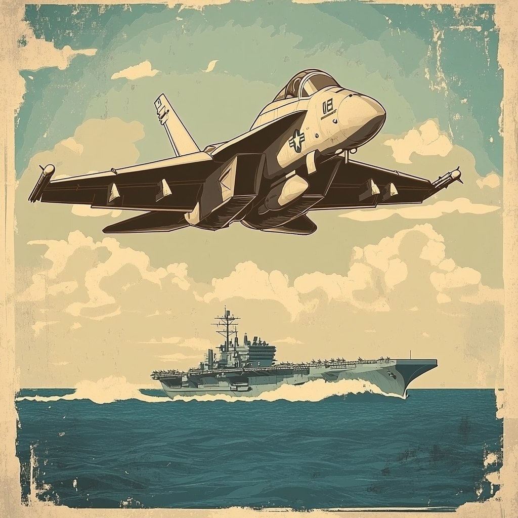Создано на основе запроса: A cartoon propaganda poster logo, natural tones, of an F-18E/F flying, ocean and US aircraft carrier in the