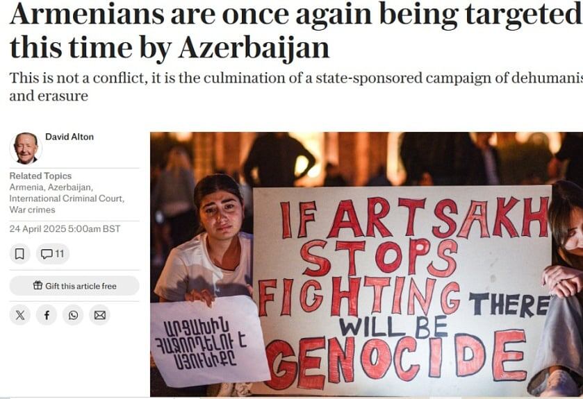 "Неразрывность между историческими и продолжающимися зверствами требует, чтобы мы говорили сейчас без двусмысленностей. Сегодня потомки тех же армян снова подвергаются нападкам — на этот раз со стороны Азербайджана, который в 2023 году завершил этническую чистку Нагорного Карабаха (Арцаха), изгнав 120 000 этнических армян с их исконной родины. Несмотря на настоятельные предупреждения экспертов по правам человека и международных организаций, мировые лидеры снова отвернулись", - говорится в статье.