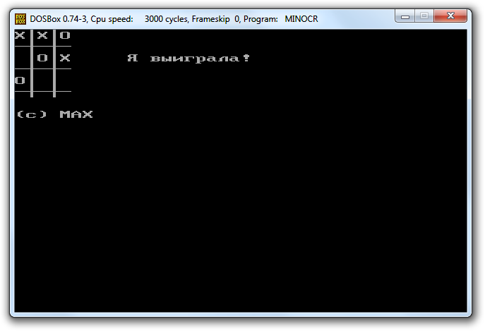 Решил вот похвастаться своим программным творением 1999-го года выпуска. В то время я увлекался программированием на ассемблере, и написал игру «крестики-нолики», уложив её логику всего в 512 байтов. 512 байтов — это размер кластера дискеты. Если написать программу меньше, то она всё равно по факту займёт один кластер, то есть, вмещение программы в ещё меньшее число байтов было бы, наверное, просто бессмысленно. Поэтому мой выбор пал именно на этот размер, тем более, что он выглядел для этого вполне подходящим, хотя, признаюсь, довольно экстремальным. Разумеется, программа 16-битная, потому что писалась под DOS, и чтобы запустить её на современных операционных системах нужно как-то эмулировать среду старого компьютера. Для этого можно использовать эмулятор DOSBox. Вот так выглядит моя программа в этом эмуляторе: Мою программу можно скачать отсюда. Распакуйте папку с программой, скачайте и установите DOSBox. Затем подключите русский знакогенератор, подмонтируйте папку с программой и з