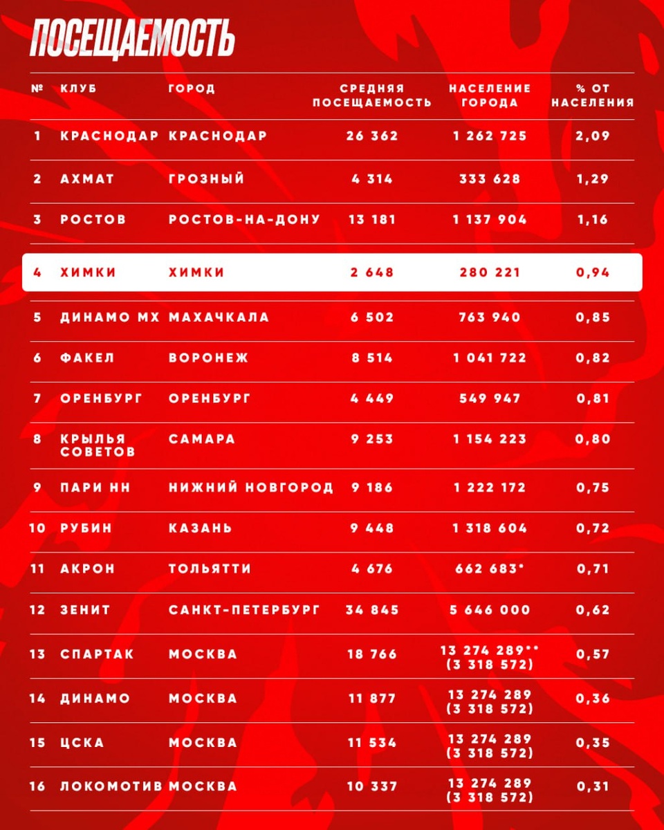 Β«Π₯ΠΈΠΌΠΊΠΈΒ» ΠΏΠΎΡΡΠ°Π²ΠΈΠ»ΠΈ ΡΠ΅Π±Ρ Π½Π° ΡΠ΅ΡΠ²ΡΡΡΠΎΠ΅ ΠΌΠ΅ΡΡΠΎ ΠΏΠΎ ΠΏΠΎΡΠ΅ΡΠ°Π΅ΠΌΠΎΡΡΠΈ Π² Π ΠΠ Π ΠΊΠ»ΡΠ±Π΅ ΡΠΎΡΡΠ°Π²ΠΈΠ»ΠΈ ΡΠ°Π±Π»ΠΈΡΡ, ΠΊΠΎΡΠΎΡΠ°Ρ Π±ΡΠ»Π° ΡΡΠΎΡΠΌΠΈΡΠΎΠ²Π°Π½Π° Π½Π° ΠΎΡΠ½ΠΎΠ²Π΅ ΠΏΡΠΎΡΠ΅Π½ΡΠ° ΠΏΠΎΡΠ΅ΡΠ°Π΅ΠΌΠΎΡΡΠΈ ΠΎΡ Π²ΡΠ΅Π³ΠΎ Π½Π°ΡΠ΅Π»Π΅Π½ΠΈΡ Π³ΠΎΡΠΎΠ΄Π°. ΠΠ° ΠΌΠ°ΡΡΠΈ Β«Π₯ΠΈΠΌΠΎΠΊΒ» Ρ