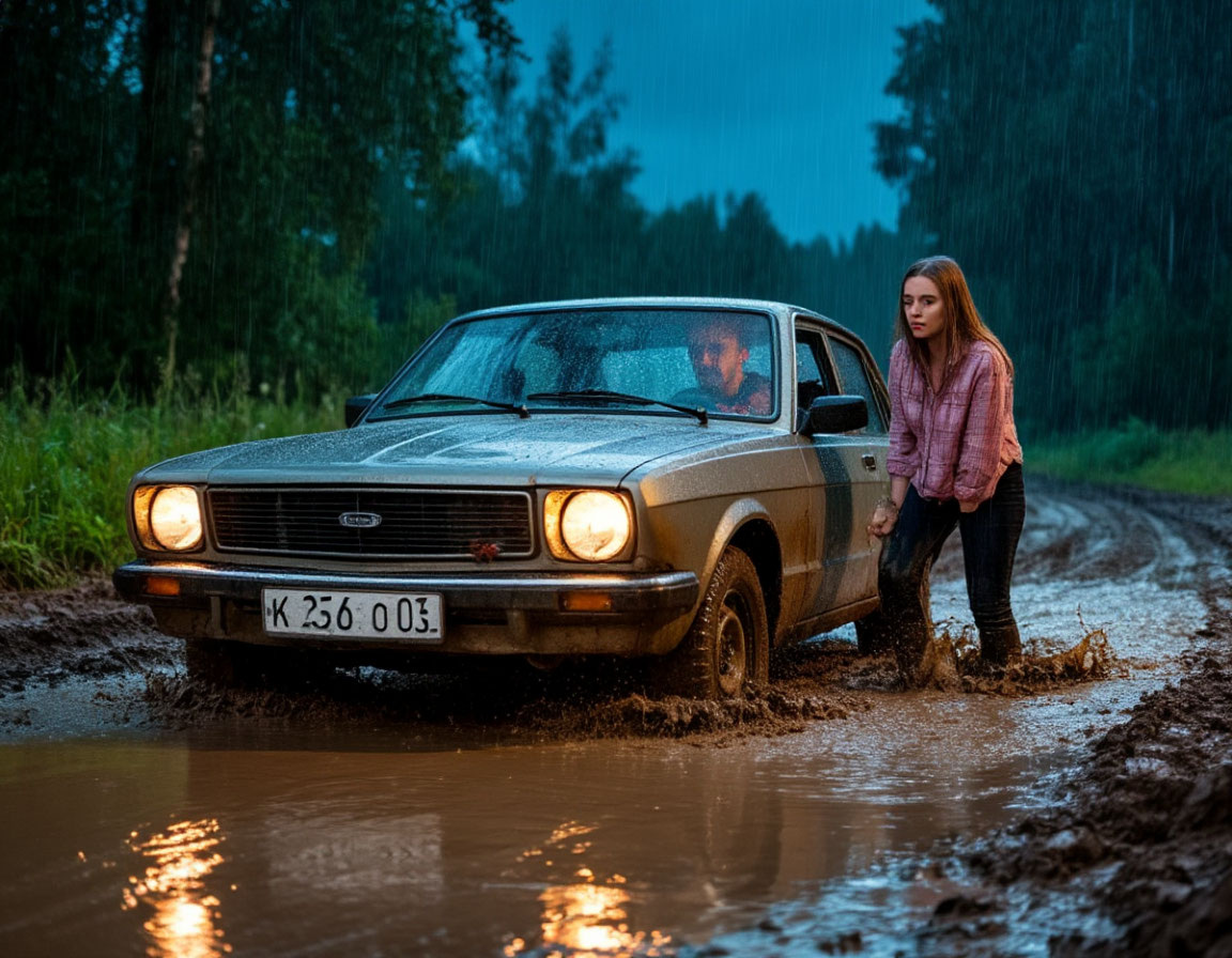 - Да, дела....,- занервничал водитель. Он начал газовать. Машина дергалась то взад ,то вперед — а толку не было. Только колеса все глубже зарывались в липкой грязи. Ребята пытались подкладывать под колеса палки, камни — все в пустую. Алексей от усталости опустился на обочину дороги. Отряхивая грязные руки, с досадой сообщил жене, что придется возвращаться пешком до соседней деревни :