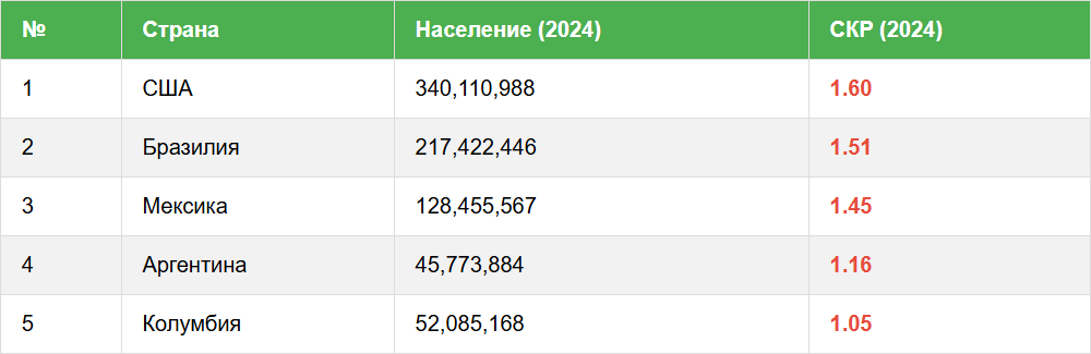Крупнейшие страны Латинской Америки — Бразилия, Мексика, Аргентина и Колумбия, на которые приходится около 80% населения региона, — теперь демонстрируют более низкую фертильность, чем США.