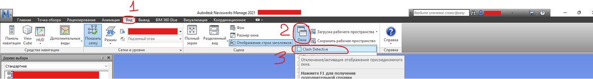 Для поиска коллизий используется инструмент Navisworks "Clash detective". Чтобы его увидеть, необходимо перейти в Вид (1) - Окна (2) - Clash detective (3).