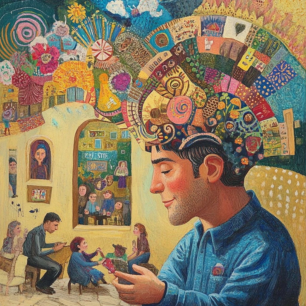 Создано на основе запроса: a colour drawing of a person full of life, creatuve, happy, surrounded by a couple of persons around interatcting