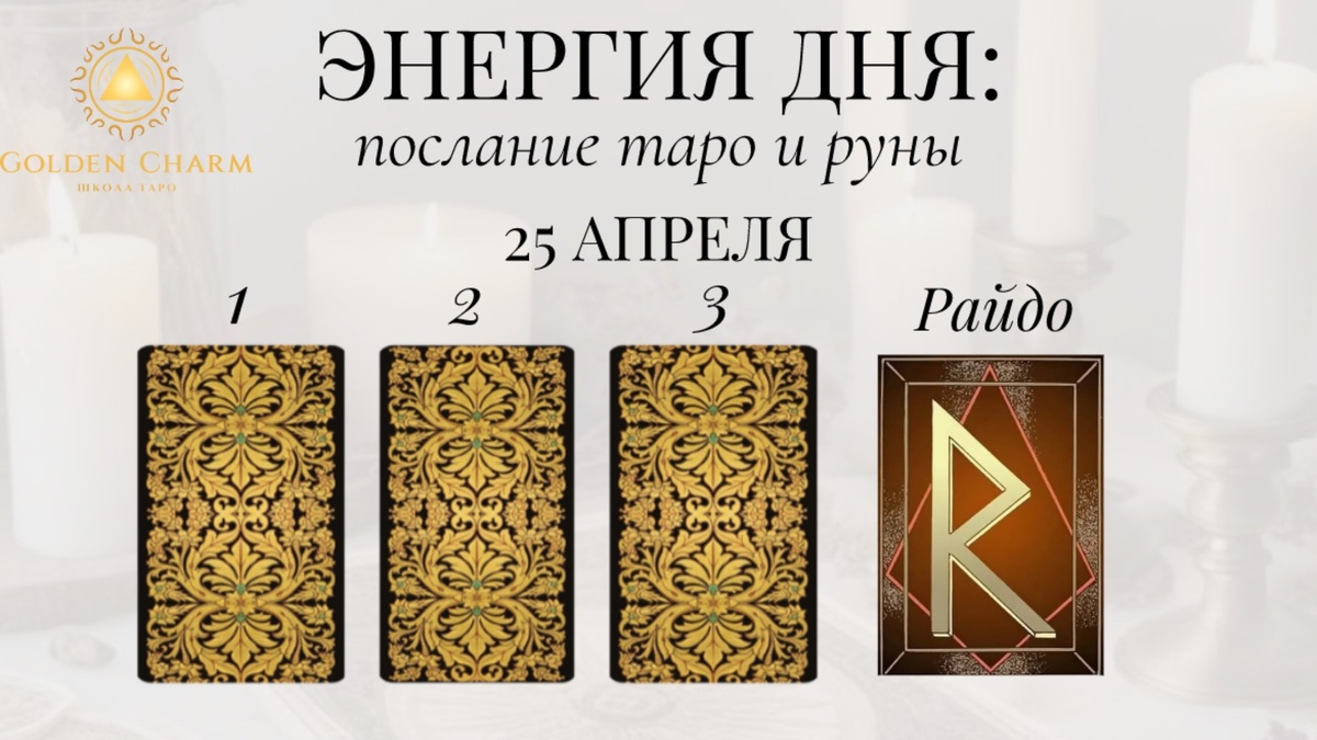 Заказать личный расклад тут✅ Прогноз на 25 апреля: что тебя ждёт Приходи на обучение Таро ✅ Выбери карту — 1, 2 или 3 — и узнай, какой путь для тебя: 1. 7 Мечей Это время переоценки действий и решений. Возможно, придется пересмотреть планы или стратегии. Сегодня полезно проанализировать ситуацию с разных сторон и принять мудрое решение. Действовать осторожно и внимательно — ключ к успеху. 2. 2 Пентаклей Наступил период балансировки между работой и отдыхом, финансовыми вопросами и личной жизнью. Тебе предстоит гармонизировать разные аспекты жизни. Это время принятия важных решений, влияющих на твоё будущее благополучие. 3. Паж Жезлов Приготовься к новым возможностям и идеям. День полон творчества и вдохновения. Уделяй внимание своему внутреннему голосу и интуиции. Сегодня важно действовать быстро и уверенно, ведь удача улыбается смелым. Руна дня — Райдо Энергичный символ движения вперёд. Сегодня самое время двигаться навстречу своим целям. Открой сердце перемена