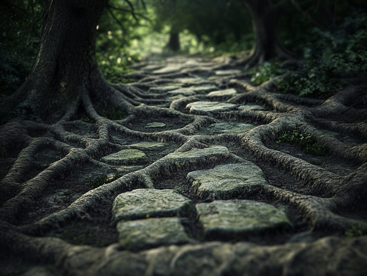 Создано на основе запроса: a huge, dense, supernatural magical forest that has grown over old cobble stone roads. Roots come out of the old cobble stones, trees grow there now. The old road is barely visible any more because nature reclaimed it long ago. Make nature seem wild, uncontrollable and dangerous. Medieval fantasy setting. --- Автоперевод: Огромный, плотный, сверхъестественный магический лес, который вырос по старым булыжным каменным дорогам. Хорошо выглядит? 🤔 https://dzen.ru/id/65c0c65c86e4f837c27b24d7 #ИИ #AI #нейросеть #midjourney #art