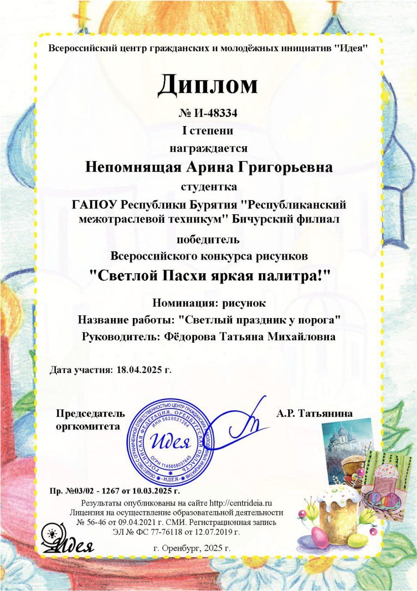 Поздравляем студентку Бичурского филиала Непомнящую Арину с получением диплома I степени за успешное участие в Всероссийском конкурсе рисунков «Светлой Пасхи яркая палитра»! 🎉🌷 Желаем ей продолжать достигать новых высот и никогда не останавливаться на достигнутом! 💪✨ Пусть в жизни будет много удачи, интересных проектов и идей, несомненных побед, уверенности в своих силах, а также мира и добра! 🌍❤️ Организатор: Фёдорова Т.М. #СПО_БУРЯТИИ #БичурскийФилиал #Творчество #Студенты #Пасха #КонкурсРисунков