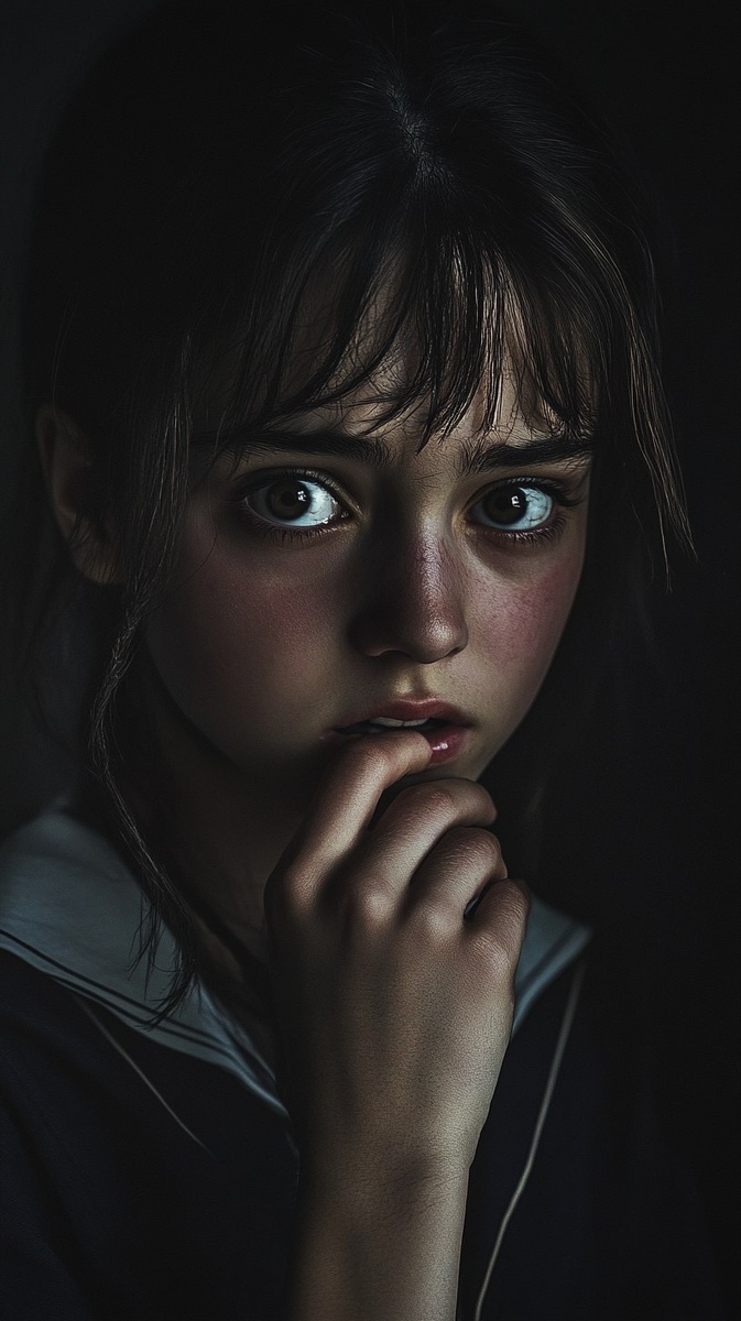 Создано на основе запроса: A young freshman school girl of 14. She is in her school uniform. Black faded out background. She is in her school uniform looking at us, she looks scared/frightened. Someone’s hand is around her mouth. The person is behind her. The atmosphere is bleak. Gloomy. Photo realism --- Автоперевод: Молодая школьница -первокурсника 14 лет. Она находится в своей школьной форме. Как тебе такая иллюстрация? 🤔 https://dzen.ru/id/65c0c65c86e4f837c27b24d7 #ИИ #AI #нейросеть #midjourney #art