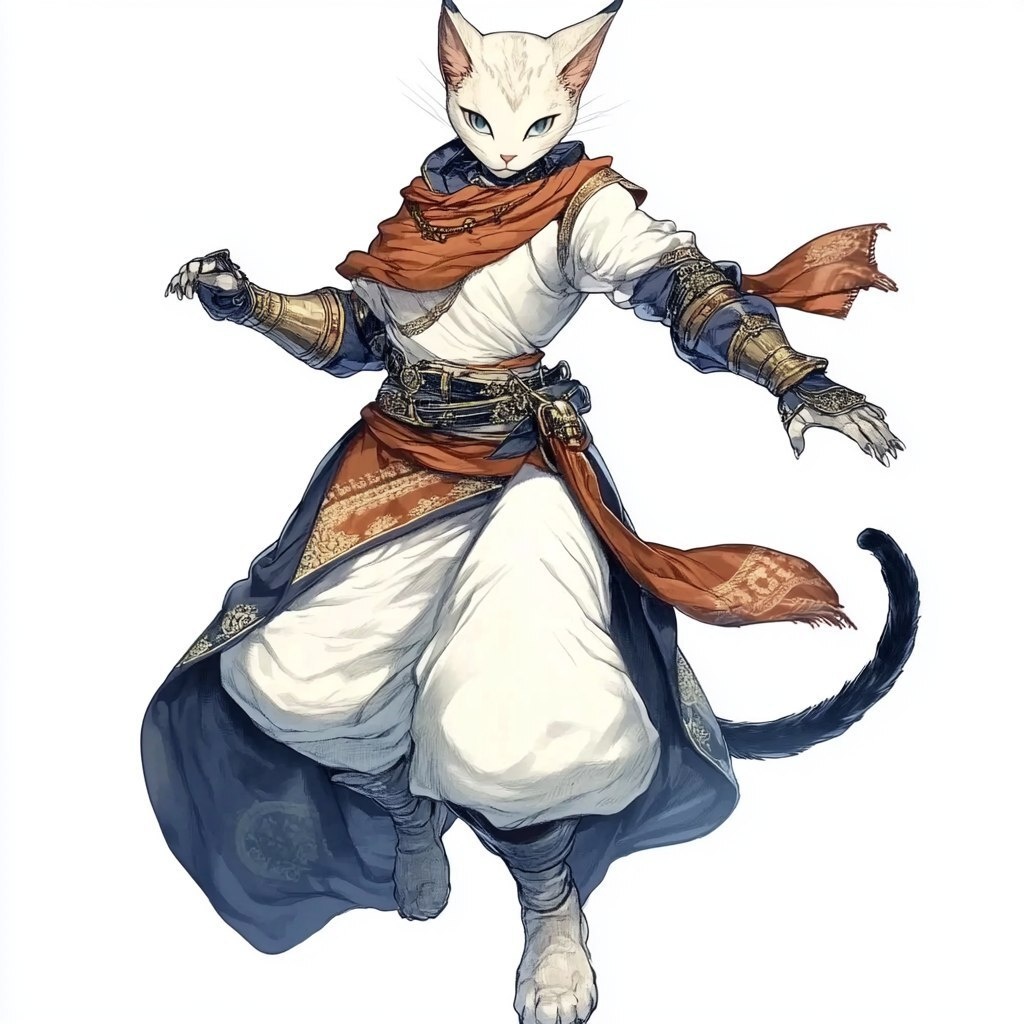 Создано на основе запроса: Fantasy concept illustration, Female, Obviously feminine, Humanoid cat, Tabaxi, Tail, Ragdoll type fur, Graceful, Smart, Indian Sari type dress, Hindi travel style, White background, High quality, Exaggerated Jumping Pose