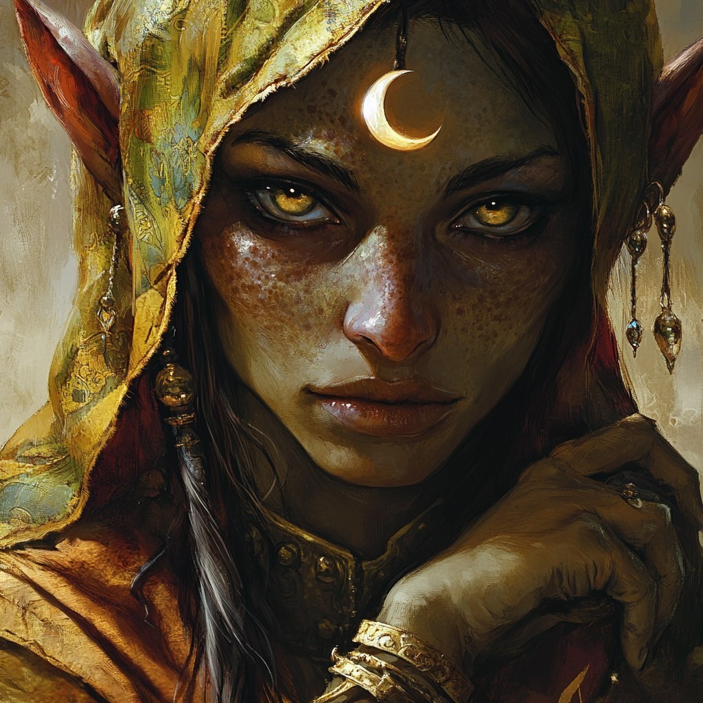 Создано на основе запроса: Female goblin with brown skin and a cresent moon in one pupil
