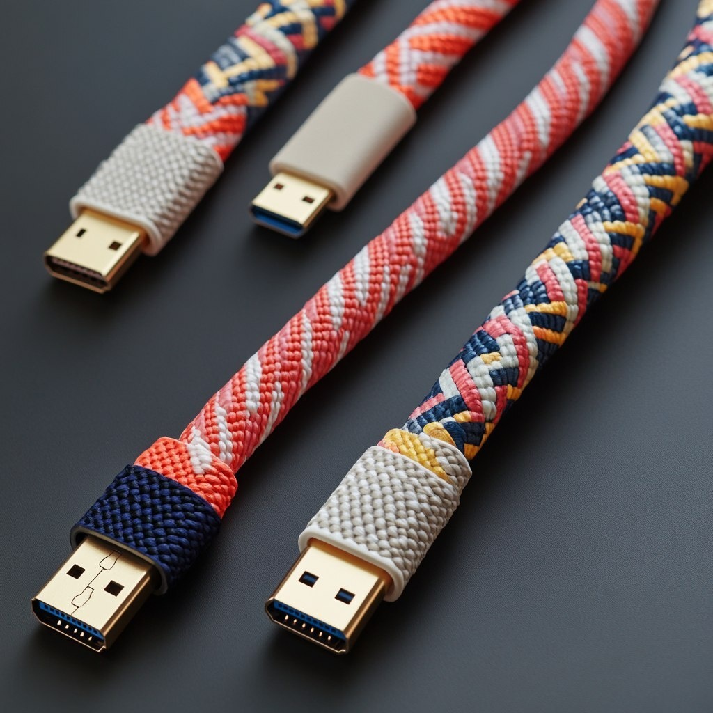 Создано на основе запроса: a set of woven USB cables with a motive of geometric wireframe patterns