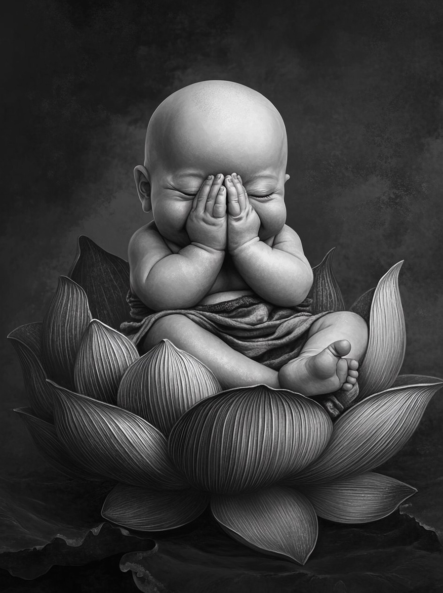 Создано на основе запроса: An epic design in black and grey realism of one bald little baby laughing Buddha, featuring covering his eyes showing his cute cubby feet while sitting in a lotus flower. The design has high contrast, high levels of detail, and dramatic lighting hyper-realistic, --- Автоперевод: Эпический дизайн в черно -сером реализме одного лысой маленькой малышки, смеящегося Будды, в котором изображены глаза, показывающие свои милые кабби -ноги, сидя в цветочке лотоса. Какое твое мнение? 🤔 https://dzen.ru/id/65c0c65c86e4f837c27b24d7 #ИИ #AI #нейросеть #midjourney #art