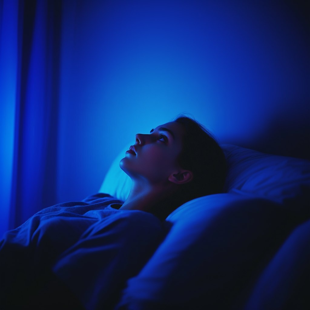 Создано на основе запроса: a woman lying in bed looking a ceiling, side view, tense scene, blue lighting