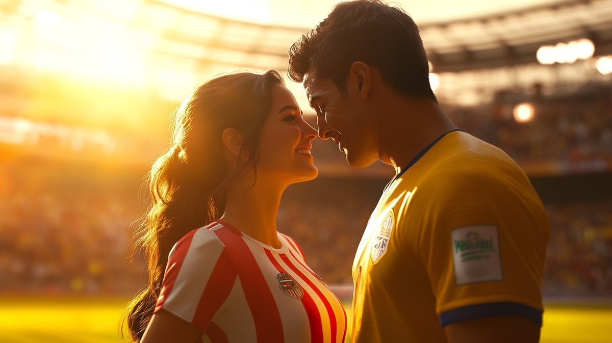 Создано на основе запроса: A romantic sunset moment on a soccer field: a young couple standing very close, almost kissing, smiling at each other with intimacy. The woman is wearing a red-and-white Chivas soccer jersey, the man is wearing a yellow Club América jersey. The background shows a blurred stadium with fans in the stands, and warm golden sunlight shining behind them. Cinematic, hyper-realistic style, natural lighting, depth of field, soft lens flare, romantic sports setting. --- Автоперевод: Романтический момент заката на футбольном поле: молодая пара, стоящая очень близко, почти целуясь, улыбаясь друг другу с близостью. Красиво вышло? 🤔 https://dzen.ru/id/65c0c65c86e4f837c27b24d7 #ИИ #AI #нейросеть #midjourney #art