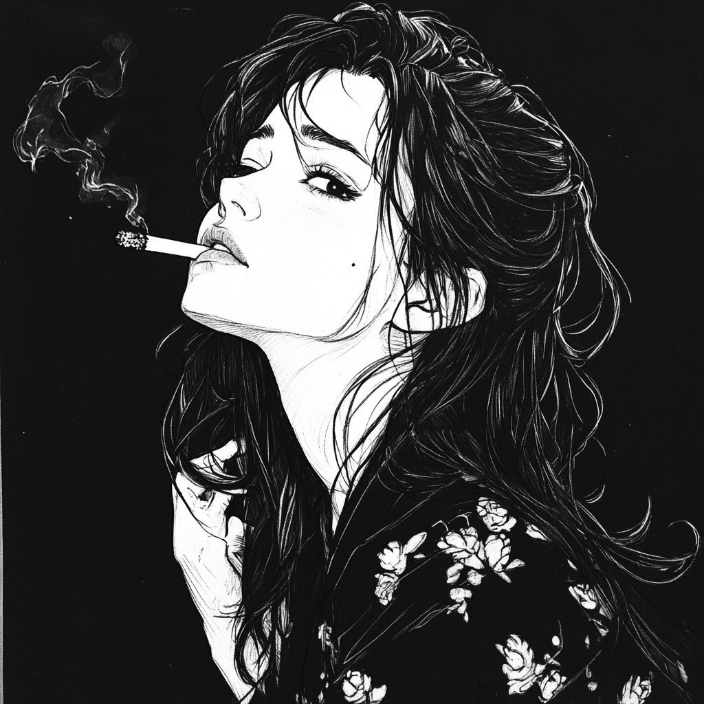 Создано на основе запроса: young girl, black and white tattoo sketch, young girl in kimono, looking to the side, sad, holding a cigarette