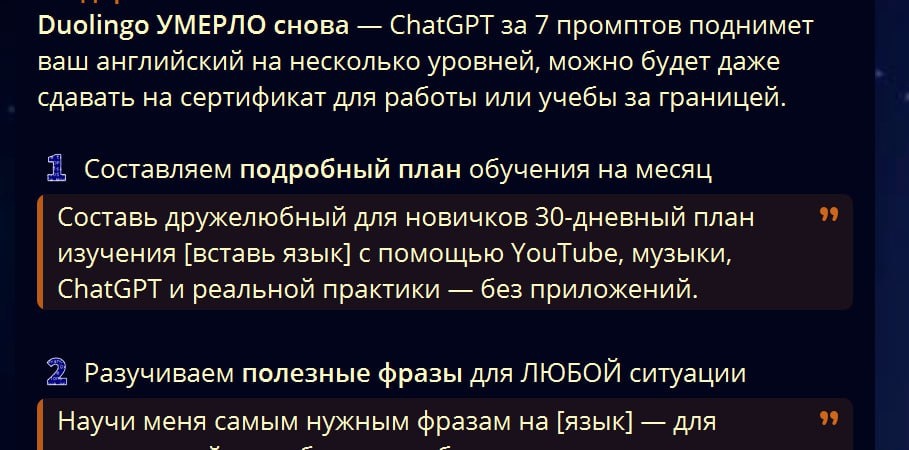 Например пост на фото — "Duolingo умерло, ChatGPT всё заменит!"