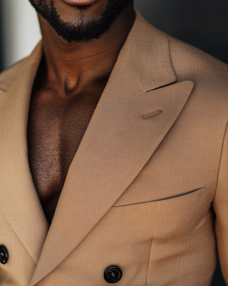 Создано на основе запроса: A really close up shot of just the chest of dapper blacck musclar chest guy in tan colored suit with the button