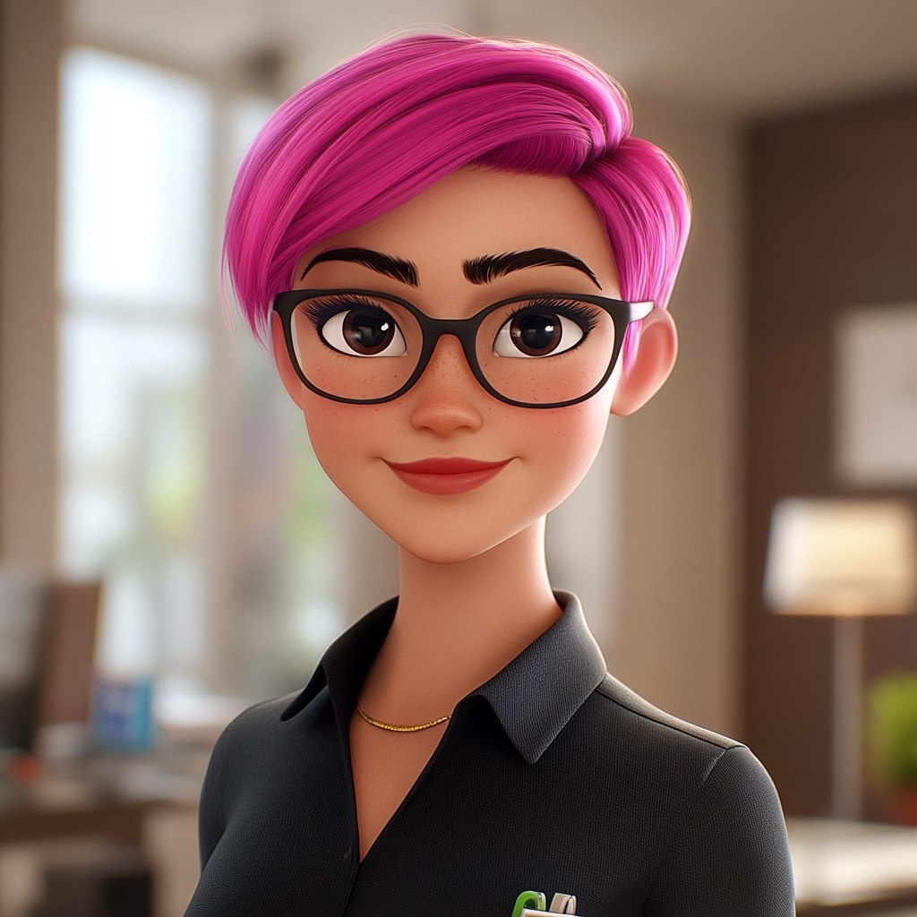 Создано на основе запроса: a pixar style image of a female business office director with short, fuschia colored hair in senior living