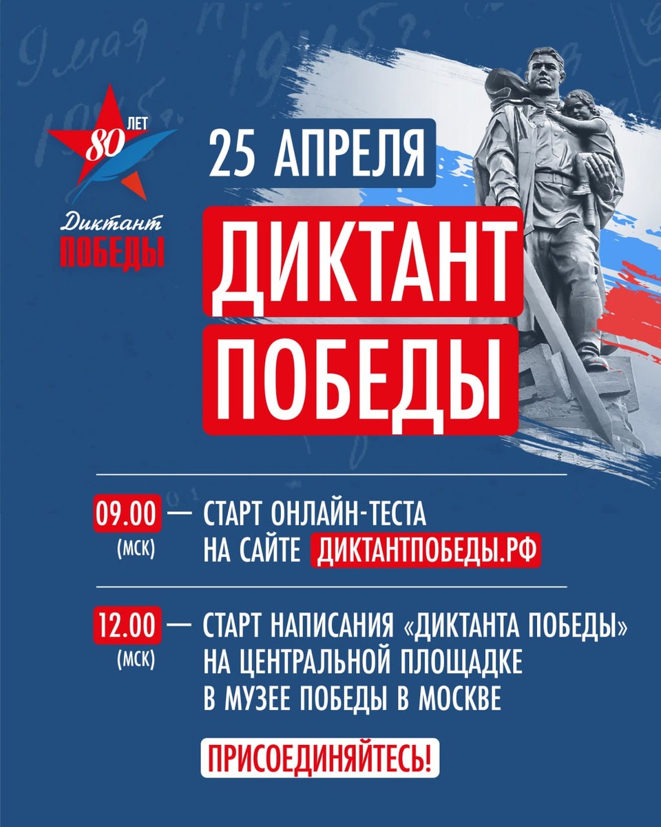 🕔 В 9.00 (мск) ответить на вопросы диктанта смогут жители Дальнего Востока и Алтайского края. В это же время будет доступна онлайн-версия теста на официальном сайте диктантпобеды.рф 📍 В 12.00 начнется написание теста на центральной площадке в Музее Победы в Москве. Также очно его напишут в школах, колледжах, в вузах, на атомных станциях, предприятиях Роскосмоса и даже на Международной космической станции. ⭐️Присоединяйтесь к самой масштабной исторической акции! #ЕРДНР #ДиктантПобеды #НашаПобеда80 #Единая Россия