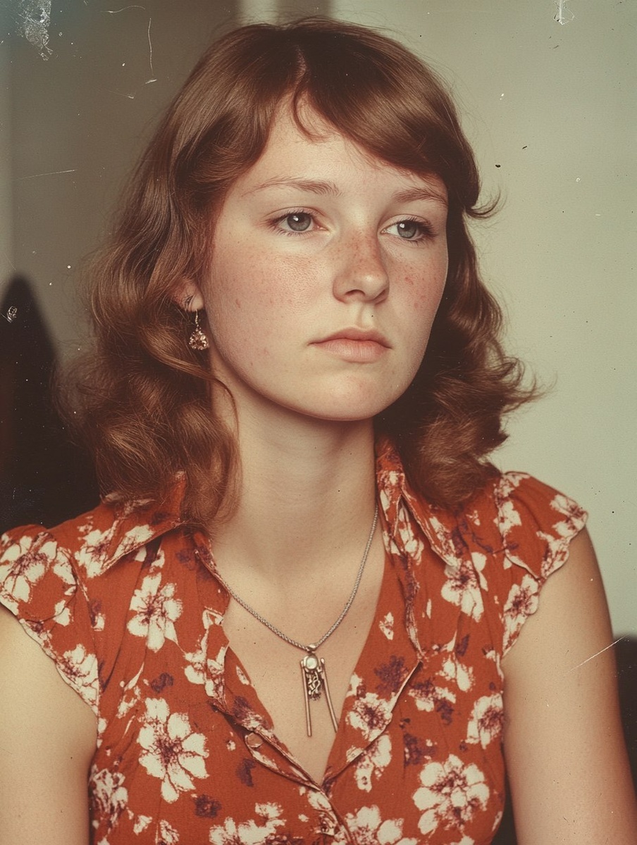 Создано на основе запроса: sad woman from 1970s uk, full torso, colour photograph