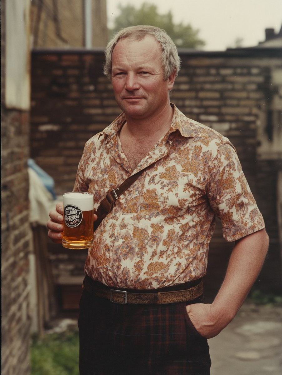 Создано на основе запроса: man holding pint from 1970s uk, full torso, colour photograph