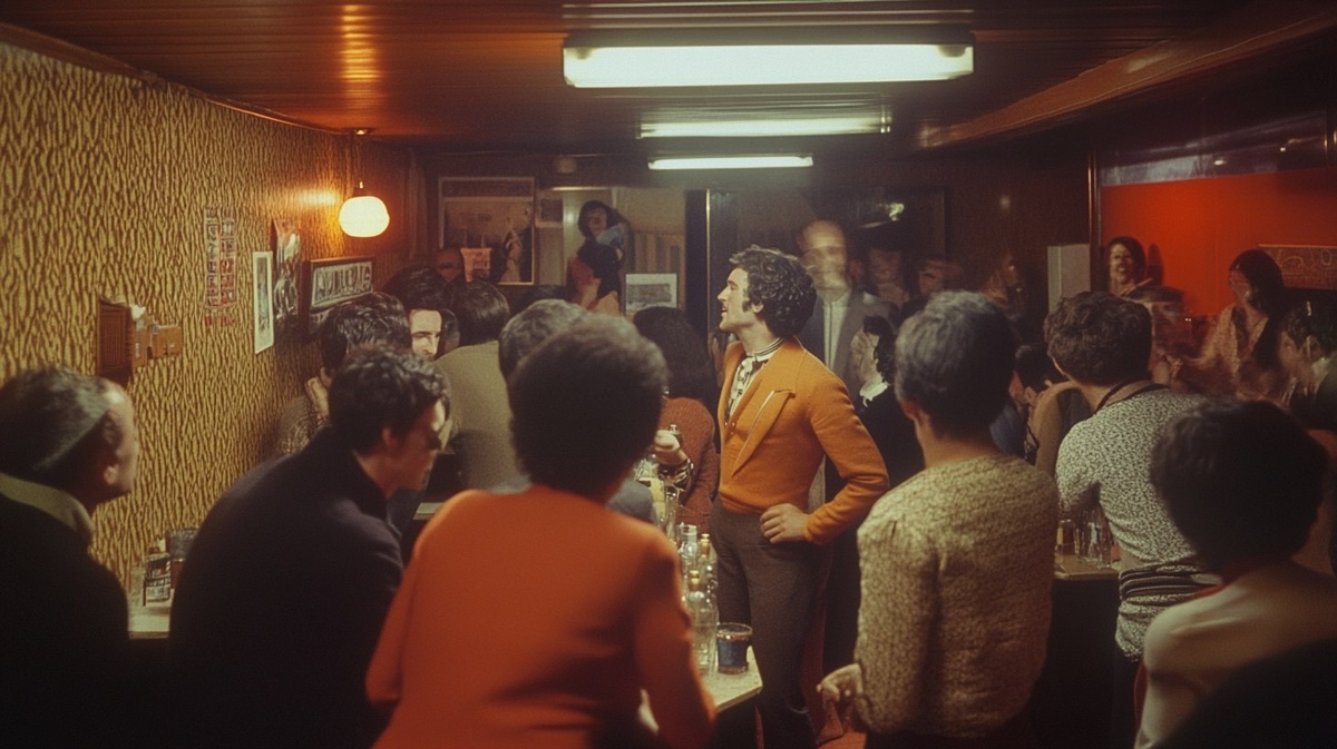Создано на основе запроса: 1970s karaoke singer singing to people in uk busy karaoke bar, singer, wall to the left, colour photograph
