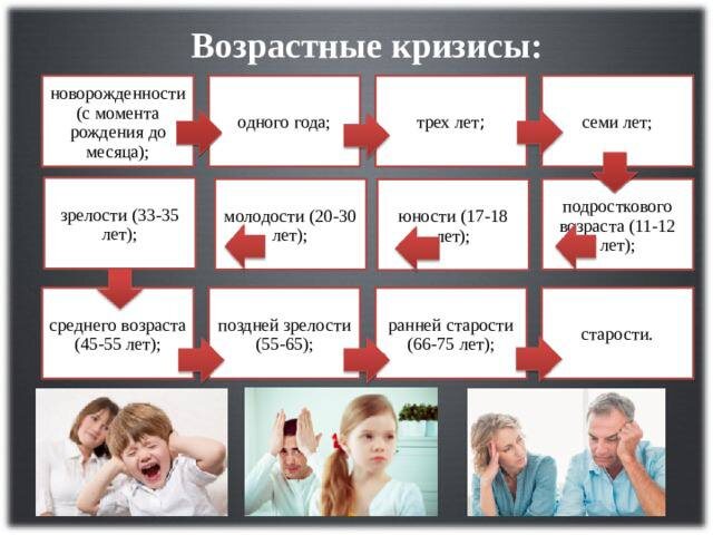 Общая периодизация возрастных кризисов, подробно про каждый можно прочитать в интернете.