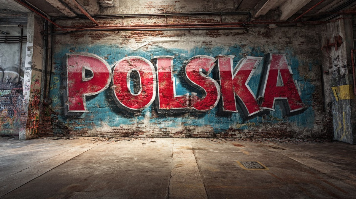 Создано на основе запроса: The word "Polska" spray-painted as graffiti on an old concrete wall, urban decay setting, moody shadows, football fan culture atmosphere hyperrealistic. Highly detailed. Hd