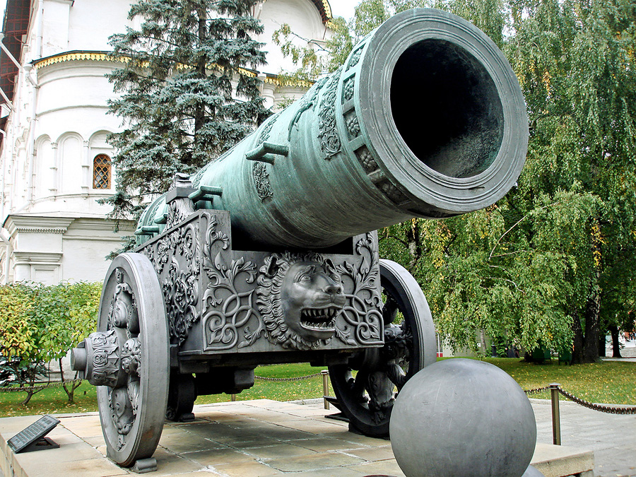 «Царь-пушка» — знаменитый памятник артиллерии и литейного дела, одна из главных достопримечательностей Московского Кремля. Калибр легендарного орудия признан крупнейшим в мире. Как и стоящий по соседству Царь-колокол, для туристов и гостей столицы это старинное орудие представляет особую историческую и туристическую значимость. Отлито орудие из бронзы, лафет чугунный. По приказу царя Фёдора Ивановича в 1586 году мастер Андрей Чохов отлил из бронзы Царь-пушку. Автором идеи являлся шурин царя Борис Годунов, в то время фактически управлявший государством. По одной из версий, своё название Царь-пушка получила в честь Фёдора Ивановича, но большинство исследователей считают, что название связано именно с размерами орудия. Отливалась она на Пушечном дворе. Изначально ствол пушки поместили на деревянном раскате неподалеку от Лобного места. Позднее бревенчатые раскаты заменили надежными каменными. Огромный вес делал её перевозку крайне проблематичной. Но с этой задачей удалось справиться при