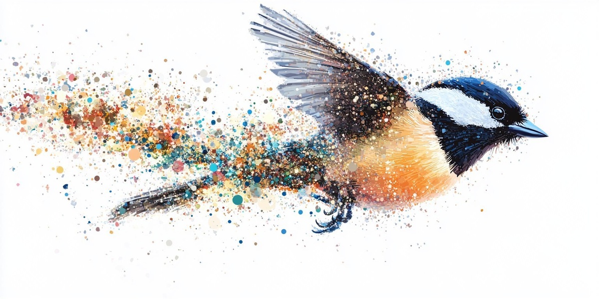 Создано на основе запроса: hectic abstract art. Exploding crisp pixel art illustration of a black-capped chickadee exploding in mid-flight. Include bubbles and speckles. Retro NASA illustration style. include white background. --- Автоперевод: Несколько абстрактного искусства. Классно выглядит? 🤔 https://dzen.ru/id/65c0c65c86e4f837c27b24d7 #ИИ #AI #нейросеть #midjourney #art