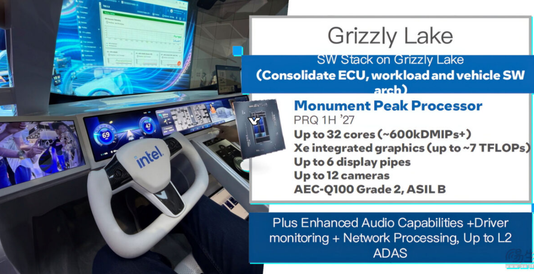 Intel поделилась своими планами на следующее поколение чипов для автомобильной промышленности. Компания, более известная своими продуктами для ПК и центров обработки данных, работает над усилением своего присутствия в автомобильной промышленности, где высокопроизводительные процессоры, часто оснащенные независимой графикой, а теперь и нейронными сопроцессорами, становятся все более конкурентоспособными. В основе ныне выпускаемых «автомобильных» процессоров Intel Malibu Lake лежат ядра Raptor Lake и компания готовит им приемников под именем Grizzly Lake, используя при этом всё тот же подход — доработку «настольной» архитектуры. В данном случае — возможно, будут использованы «настольные» Nova Lake-S. Grizzly Lake, судя по опубликованной дорожной карте, дебютируют во второй половине 2026 года Процессоры под кодовым названием Monument Peak будут включать до 32 ядер, а также интегрированную графику на базе ядер Xe. Портал 3elife, который получил слайды, предполагает, что этот продукт получе