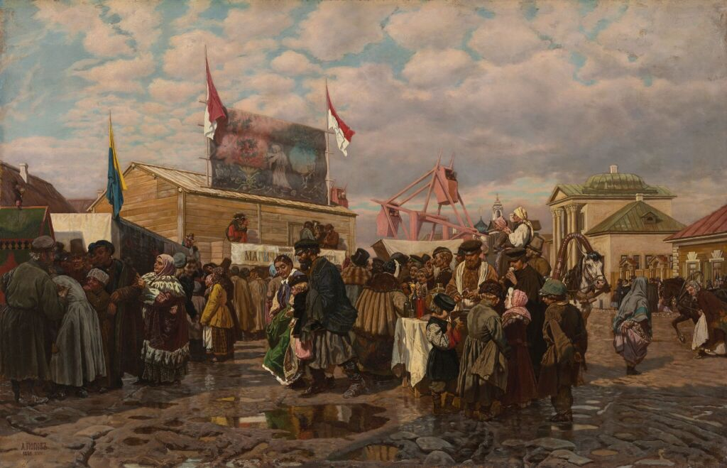 Павильоны, палатки, качели, слегка узнаваемая городская застройка демонстрируют образ тихой патриархальной жизни провинции. Сарай с вывеской «Новый магический театр» и афишей с чертями и скелетом, балконом с музыкантами-зазывалами привлекают горожан. Вдали виднеются круглые качели, прообраз будущего колеса обозрения, упоминавшиеся А.С. Пушкиным в романе «Евгений Онегин». Нежное голубое небо в светлых облаках на фоне весенней распутицы создаёт праздничное весеннее настроение.