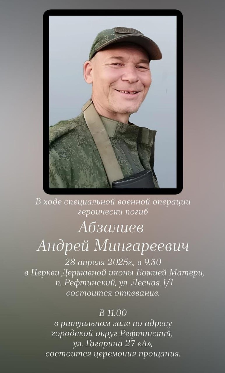 В ходе специальной военной операции героически погиб Абзалиев Андрей Мингареевич. 28 апреля 2025г., в 9.30 в Церкви Державной иконы Божией Матери, п. Рефтинский, ул. Лесная 1/1 состоится отпевание. В 11.00 в ритуальном зале по адресу городской округ Рефтинский, ул. Гагарина 27 «А», состоится церемония прощания. #МЫВМЕСТЕ #Рефтинский