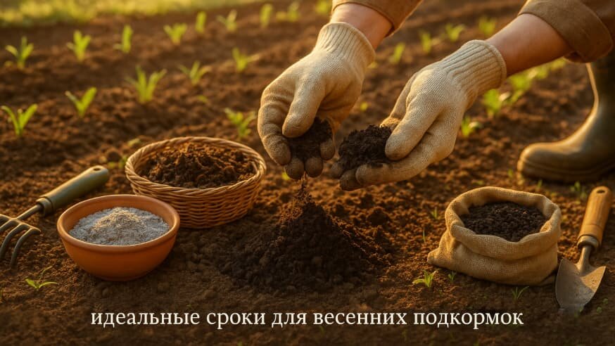 Не менее важно, когда вносить удобрения. Ранней весной, когда земля только оттаивает, сосредоточьтесь на подготовке почвы с помощью компоста и перегноя. Когда почва прогреется до +10°C, можно начинать вносить золу и биогумус. А жидкие подкормки лучше отложить до момента, когда растения уже укоренятся и начнут активный рост.