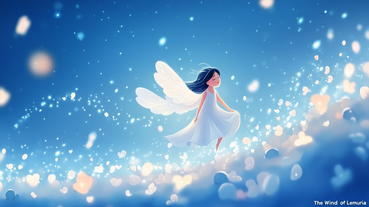 Создано на основе запроса: illustration of 20-year-old asian smilling angel is flying on the blue sky. A dreamy and ethereal scene inspired by "The Wind of Lemuria": A soft, gentle breeze flows through small crystal clusters. Transparent waves shimmer in the distance, and delicate petals and glowing particles dance through the air. The overall atmosphere is mystical, calm, and full of ancient love and harmony. The wind feels alive whispering forgotten songs of Lemuria. --- Автоперевод: Иллюстрация 20-летнего азиатского удивления ангела летит на голубом небе. Необычно получилось? 🤔 https://dzen.ru/id/65c0c65c86e4f837c27b24d7 #ИИ #AI #нейросеть #midjourney #art
