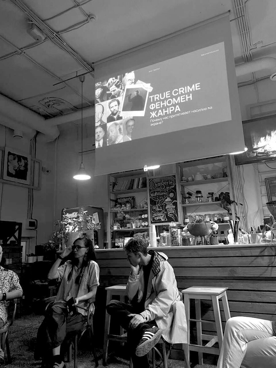 TRUE CRIME или как прошла вчерашняя встреча? За окном зловеще мерцали молнии, предвещая надвигающуюся бурю, а следом, словно в предвкушении чего-то ужасного, гремел гром. Когда часы пробили 19:00, как будто по заказу, начался ливень — холодные струи воды, словно слёзы неба, обрушивались на землю. В кафе, погружённом в полумрак, приглушённый свет лишь изредка касался лиц тех, кто решился прийти — отважных или же безумных. Они собрались здесь с единственной целью: разгадать тайну. Почему же людям так притягательно насилие на экране? Что скрывается за феноменом жанра TRUE CRIME, который манит и завораживает, словно тёмное заклинание? В воздухе витала напряжённая атмосфера, словно сама буря ожидала ответа... И ответ, разумеется, хрен я дам тут. Надо было на лекцию приходить, если интересно! Но огромная благодарность тем, кто не испугался грозы и пришёл (в общем-то, практически всем, кто записался, как я понял). Мне было очень приятно видеть так много добрых кровожадных лиц. К счастью,