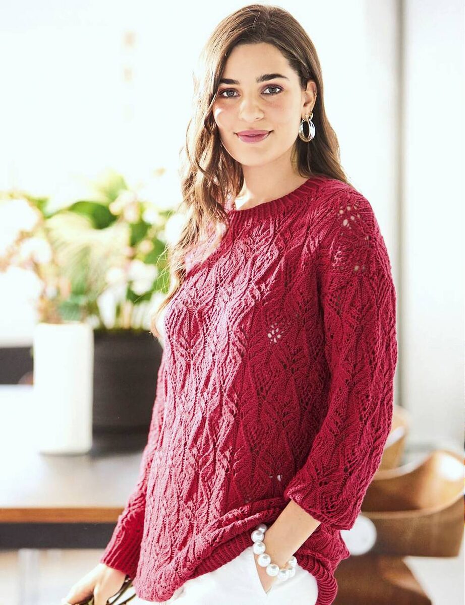 1. Благодаря ажурному узору в виде кос и крою длиной до бедер эта вишнёвая модель станет удобным пуловером на все времена года. И последнее, но не менее важное: этому способствует приятная на ощупь мягкая пряжа из смеси хлопка и сои. При наличии небольшого опыта вязания и соответствующей схемы вязание ажурного узора гарантированно никогда не будет скучным. Манжеты и отделка круглого выреза горловины выполнены резинкой 1/1;