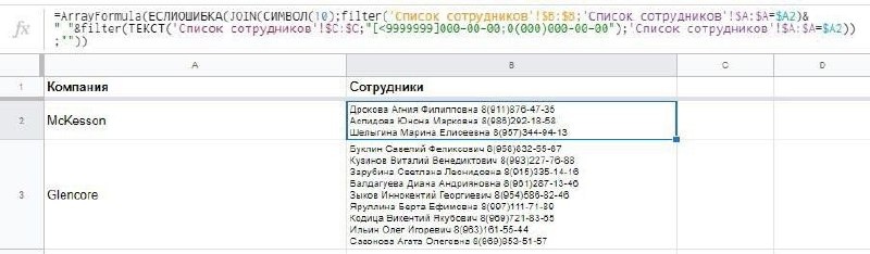 Собираем данные в виде ФИО+телефон по сотрудникам компании в одной ячейке У вас есть база клиентов и данные о сотрудниках и их контактах. И вы хотите видеть всех сотрудников одной компании в одной ячейке. Многие в такой ситуации вводят всю информацию в одну ячейку руками, благо можно переходить на следующую строку в ячейке с помощью Alt+Enter. Но лучший путь - это создать отдельно реестр контактных лиц, где выбирать компанию из выпадающего списка (чтобы не было возможности ошибиться) и вводить в каждой отдельной строке одного человека с его контактами и другими нужными вам полями. Тогда будет возможность фильтровать такой список, форматировать телефоны, создавать ссылки на адреса эл. почты и иначе взаимодействовать с этими данными. А собрать и подтянуть данные по всем сотрудникам одной компании всегда можно с помощью QUERY или FILTER. Если нужно отформатировать при этом данные - например, номера телефонов - пригодится функция ТЕКСТ / TEXT. Файл с примерами 📗 Канал и Чат 📕 Оглавл