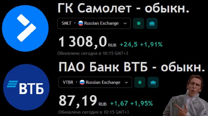 🔥 День сильных отчётов: акции ВТБ и Самолёта растут на 2% ГК «Самолёт» по итогам 2024 года: 🔸 Выручка компании выросла на 32% до 339,1 млрд рублей 🔸 EBITDA увеличилась на 16% 83,6 млрд рублей. 🔸 Чистая прибыль составила 8,2 млрд рублей (26 млрд в 2023 году). Скорректированная чистая прибыль — 30,3 млрд рублей. 🔸 Чистый долг — 116,1 млрд рублей. Долг к скорректированной EBITDA — 1,06x. ВТБ за 1 квартал: 🔸 Чистая прибыль выросла на 15,4% до 141,2 млрд рублей (рентабельность капитала — 20,9% против 22,1% годом ранее. В условиях жесткой ДКП — хороший уровень). 🔸 Чистые процентные доходы составили 52,6 млрд рублей 🔸 Кредитный портфель по итогам первого квартала составил 23,9 трлн рублей @if_news