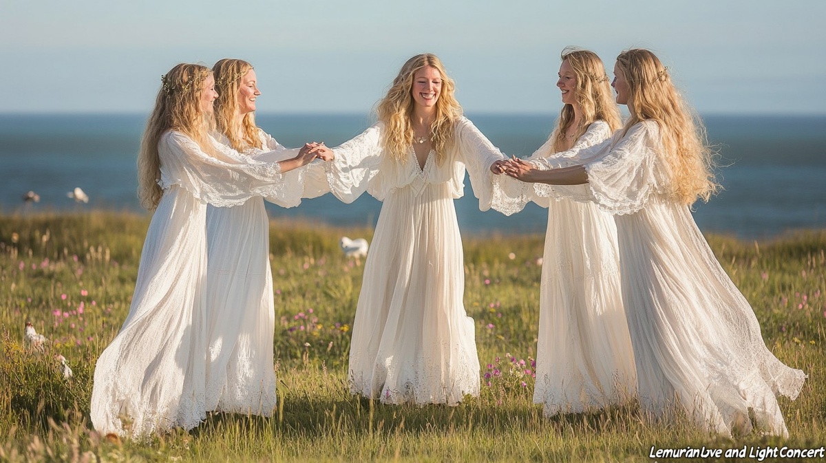 Создано на основе запроса: A serene and spiritual scene for "Lemurian Love and Light Concert": Four 30-year-old golden hair smilling women