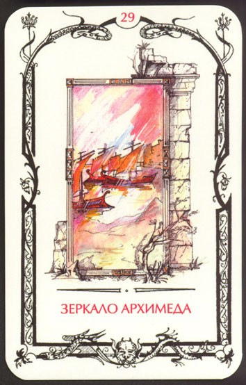 Зеркало Архимеда это карта колоды, обозначает изменения, потрясение, решительность, конфликт, пыл. Карта олицетворяет собой трудную ситуацию, для разрешения которой требуются нестандартные методы и свежий взгляд. Обычные методы в этой ситуации не помогут. Карта олицетворяет собой человека, обладающего незаурядным умом, который способен находить нестандартные решения в сложных ситуациях. Он умеет стойко переносить трудности и защищать себя. Более того, после того как он защитится, он с радостью переходит в наступление и сокрушает своего противника. У этого человека непростой характер и небольшое терпение. Он предпочитает действовать, а не размышлять. Его гнев может быть очень сильным и способен вырваться наружу, разрушая всё вокруг. Раздражительность, гнев, избыток чувств, ссора. Неистовая и всепоглощающая страсть. Чрезмерное и мучительное сексуальное желание. Или же ненависть. Карта свидетельствует о том, что вам предстоит бороться за осуществление своей мечты. Времени на раздумья ост