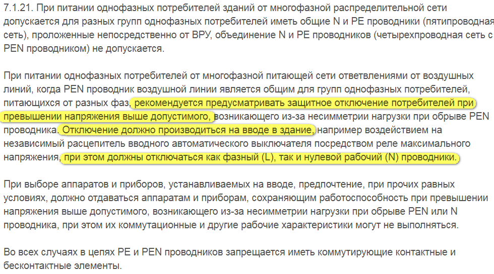 До сих пор нет никаких рекомендаций и требований, и также запретов на установку реле напряжения. Пункт ПУЭ-7, п 7.1.21 был написан примерно в 2002 году, когда про реле напряжения никто не слышал. Выключение могло производиться только одним способом - посредством реле максимального напряжения, которое при превышении порога отключало двухполюсный автомат на вводе. О чем и было сказано в этом пункте. Именно про 2п АВ тут и пишется, но не про РН. Почему? Потому, что по регламенту АВ является разъединителем, а РН не является. Оно относится к устройствам контроля и управления, поэтому тут предъявляются совершенно разные требования. По большому счёту, ни одно устройство с автоматическим повторным включением (АПВ) по определению не может считаться разъединителем. А ПУЭ 7.1.21 ведёт речь именно о защитном ОТКЛЮЧЕНИИ, т.е. именно о разъединителях и к РН по сути не относится вообще. И вообще в нормативке тема РН проработана очень слабо, говорил про это в частности тут: Просто некоторые странн