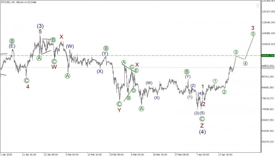 https://basechop.ru/wordpress/?p=40001 По криптовалютной паре BTC/USD с точки зрения волнового анализа в долгосрочной перспективе формируется крупный бычий импульс, который состоит из подволн (1)-(2)-(3)-(4)-(5). На текущем графике мы видим развитие второй его половины. Была завершена импульсная волна (3), после чего началось формирование сложной коррекции (4). Коррекционная волна (4) может имеет форму тройного зигзага W-X-Y-X-Z. На сегодняшний день он смотрится полностью завершенным. Финальная действующая волна Z завершилась в форме стандартного зигзага [A]-[B]-[C]. На последнем участке графика мы можем наблюдать развитие бычьего импульса, в составе которого уже завершена подволна 1. Также завершенной выглядит коррекция 2, и ряд небольших подволн [1] и [2]. Вполне возможно, что в ближайшее время мы увидим построение подволны [3] и бычий рост в направлении максимума 99544.00. Ранее на указанной отметке была завершена подволна [B]. В текущей ситуации можно рассматривать открытие длинн