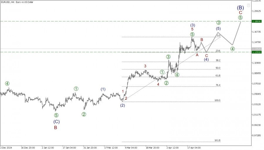 https://basechop.ru/wordpress/?p=40003 Предполагается, что в долгосрочной перспективе по криптовалютной паре EUR/USD формируется крупный зигзаг (A)-(B)-(C). Сейчас формируется крупная коррекционная волна (B), которая принимает форму восходящего зигзага A-B-C. На четырехчасовом таймфрейме представлена разметка конечной части коррекции B, после которой цена пошла вверх в импульсе C. Волна C – импульс, состоящий из подволн [1]-[2]-[3]-[4]-[5]. Завершены только первые две части – импульс [1] и коррекция [2]. В ближайшее время ожидается развитие второй половины крупной импульсной подволны [3], как показано на графике. Есть большая вероятность, что вся импульсная волна C завершится в районе предыдущего максимума 1.186. Однако после волны [3], ожидается небольшой откат вниз в коррекции [4], которая может принять любую коррекционную модель. Пока сложно сказать какую. В текущей ситуации можно рассматривать открытие длинных позиций с целью забрать прибыль на завершении импульсного тренда. Либо