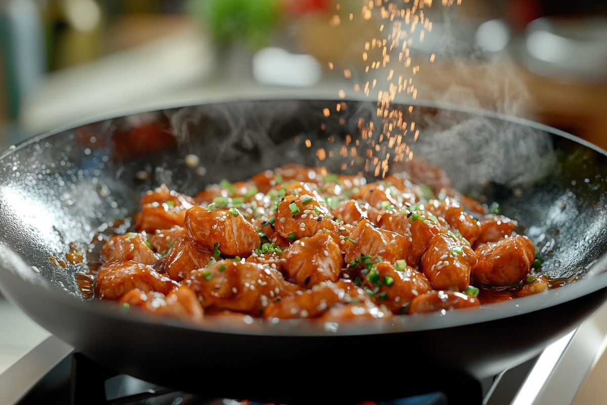 Создано на основе запроса: Title: Teriyaki Salmon | STYLE: Close-up Shot right view | EMOTION: realistic as possible | SCENE: KEYWORD | TAGS: High-end food photography, clear composition, mouth-watering, indulgent, gourmet, cuisine, recipe | CAMERA: Nikon Z7 | FOCAL LENGHT: soft direction light | PRODUCTION : food stylist | TIME : daytime | LOCATION TYPE : kitchen near windows,