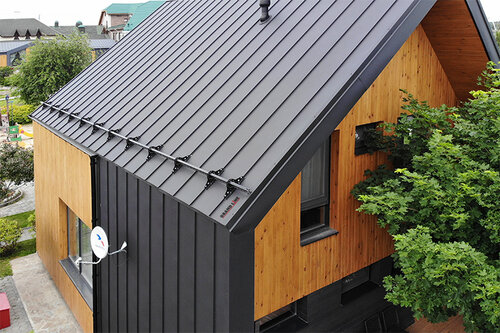 Поговорим подробнее про фальцевую кровлю Grand Line. Этот строительный материал, сочетающий в себе эстетичность, надежность и долговечность, представлен в широком разнообразии. Производитель предлагает следующие типы фальцевых панелей: • Кликфальц®. Панели устанавливаются без использования специального инструмента – крепление осуществляется саморезами через отверстия вдоль замочной части. Система замков обеспечивает герметичность покрытия за счет отсутствия открытого крепежа. Толщина основания – 0,5 мм, полезная ширина панели – 510 мм, высота замка – 25 мм, рекомендуемый уклон кровли – от 16°. • Кликфальц® Pro. Панели с замковой системой, обеспечивающей быстрый и надежный монтаж без использования специального инструмента. Толщина основания – 0,5 мм, полезная ширина панели – 470 мм, высота замка – 33 мм, рекомендуемый уклон кровли – от 10°. • Кликфальц® Double Pro. Усовершенствованная версия с двойным замком для повышенной герметичности и устойчивости к нагрузкам. Подходит для регионов